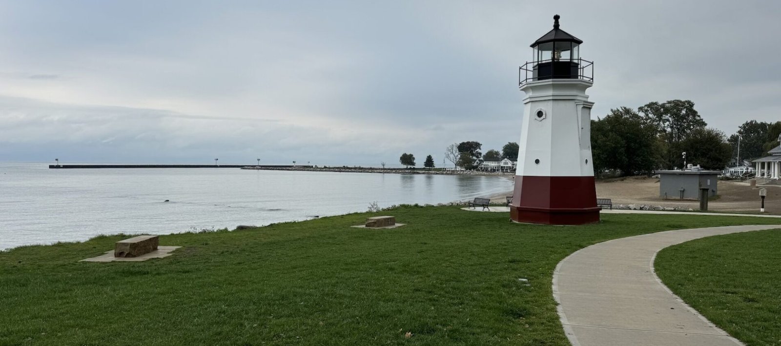 I enjoyed my stop at the Vermillion Lighthouse. There is a very small beach and some benches and it was a nice, peaceful area. That said, I did visit on a day with not the best weather, so it’s possible that it’s busier (and less peaceful) on nicer days. If you’re starting your Lake Erie lighthouse tour in the morning, I recommend grabbing a pastry or a snack and enjoying it here (I had mine at Lorain Harbor, but the lighthouse in Vermillion would have been a much better choice).